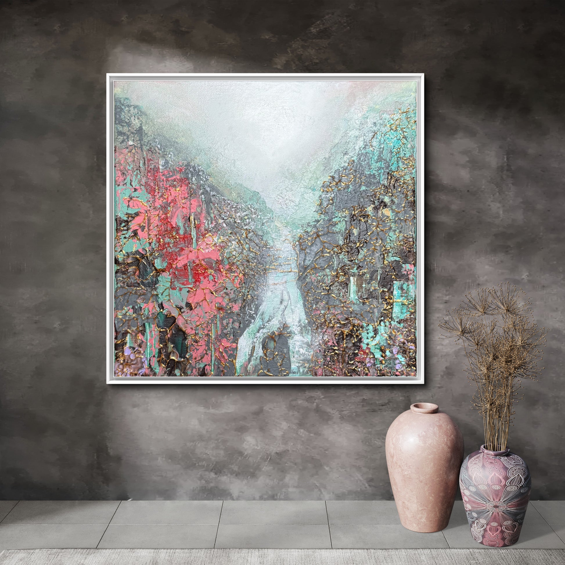 De kraftfulla partierna i målningen balanseras av mjuka övergångar skapade med pensel, vilket ger en harmonisk rytm. Resultatet är ett verk som drar blickarna till sig och samtidigt bjuder in till att stanna upp och upptäcka nya detaljer varje gång man ser på det.