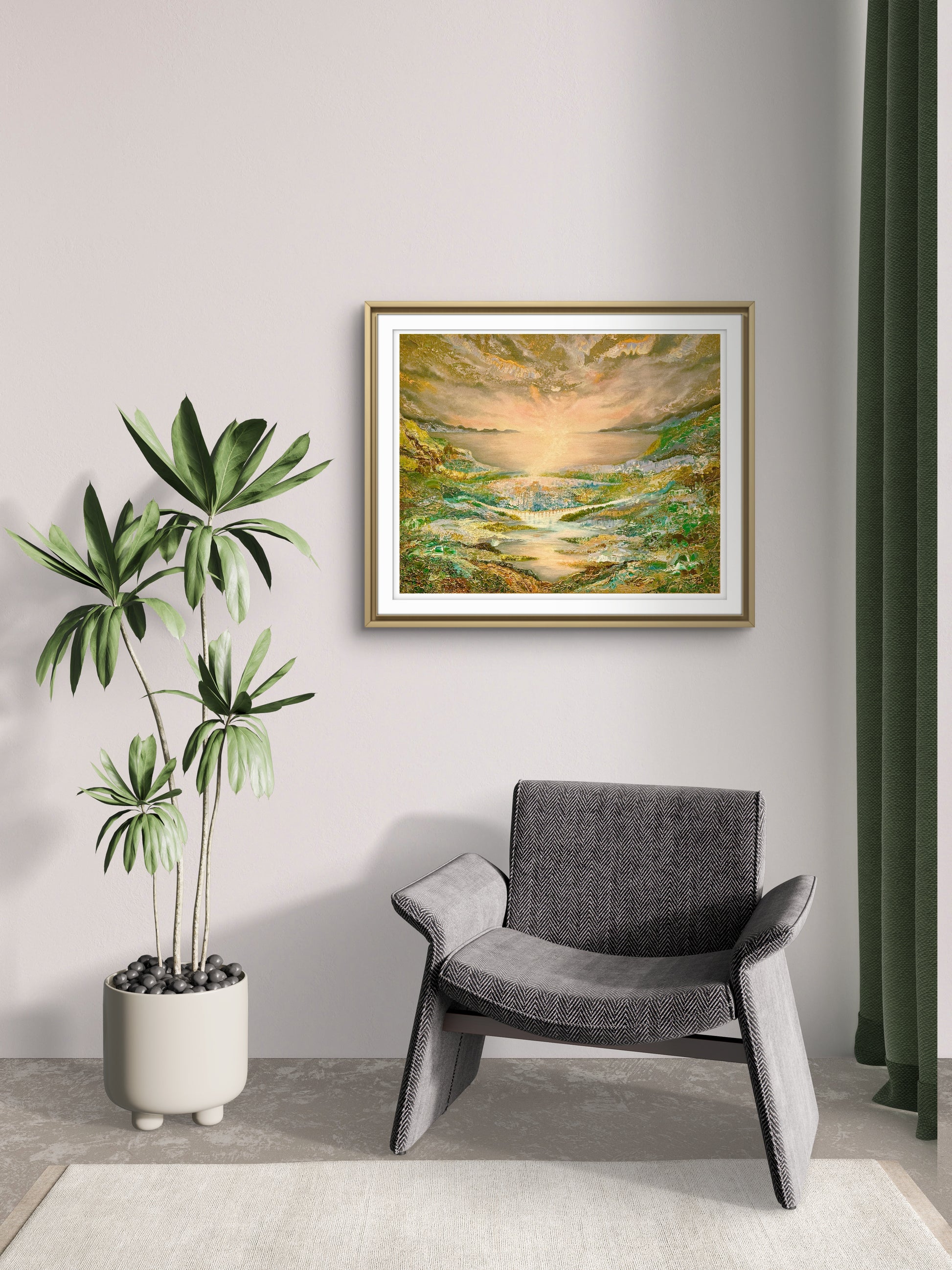 Detta abstrakta landskap skildrar en lugn vy där livfulla färger smälter samman för att framkalla en känsla av stillhet. Den eteriska himlen övergår från mjuka nyanser till djupare, och lyser upp de böljande kullarna och speglade vattnet nedanför. Och i dess centrum en gyllene stad. Texturerade penseldrag skapar djup och inbjuder betraktaren att utforska naturens spektakulära detaljer.