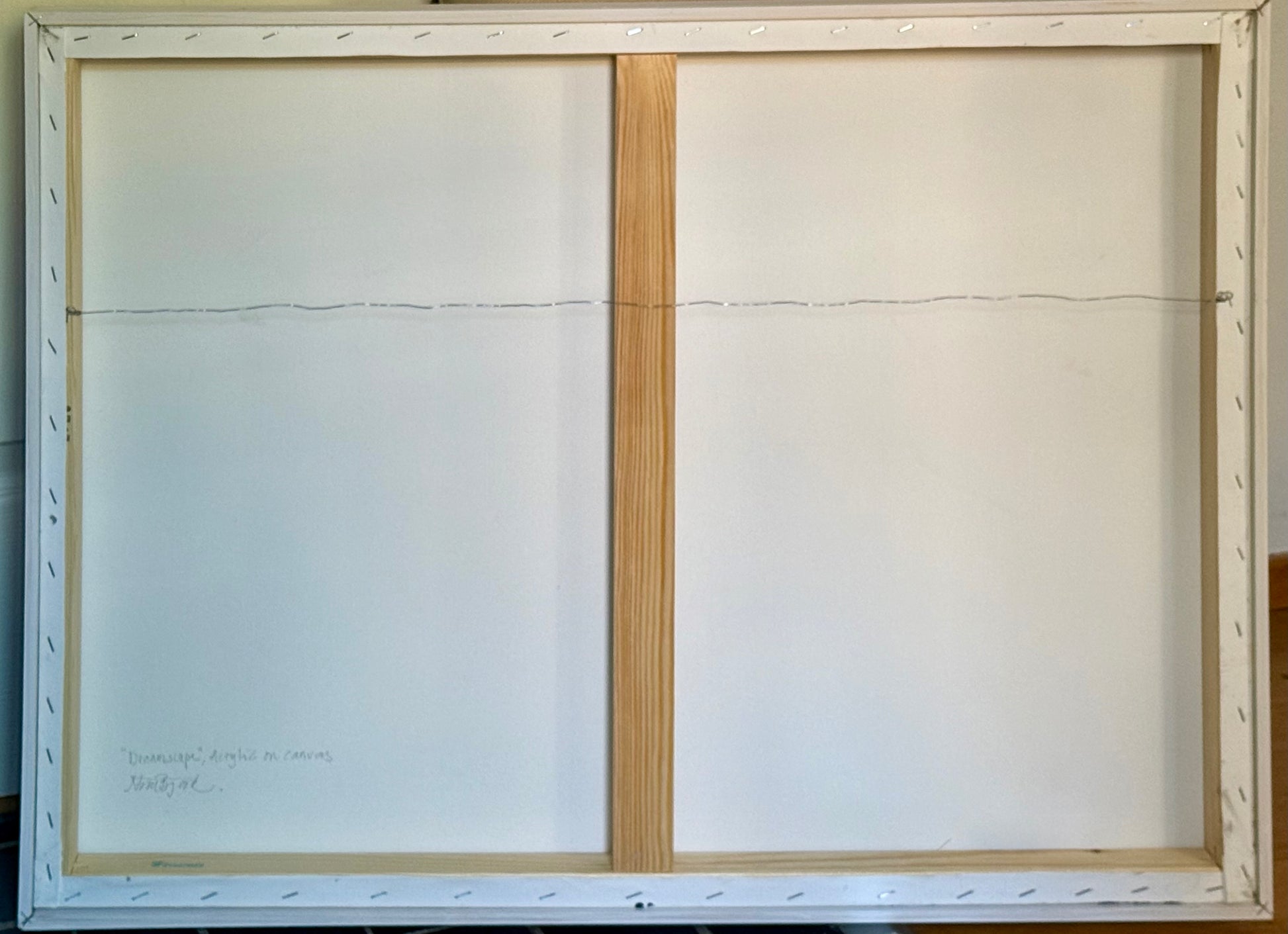 Med akryl på uppspänd canvas har konstnären skapat lager av harmoniska färger och arbetat in textur så att ytan nästan får en 3-dimensionell effekt. Längst ned vilar en slöja av dimma som bildar en form lik en fågel som breder ut sina vingar för att flyga mot ett mjukt ljus — en symbol för början, övergången, drömmen.