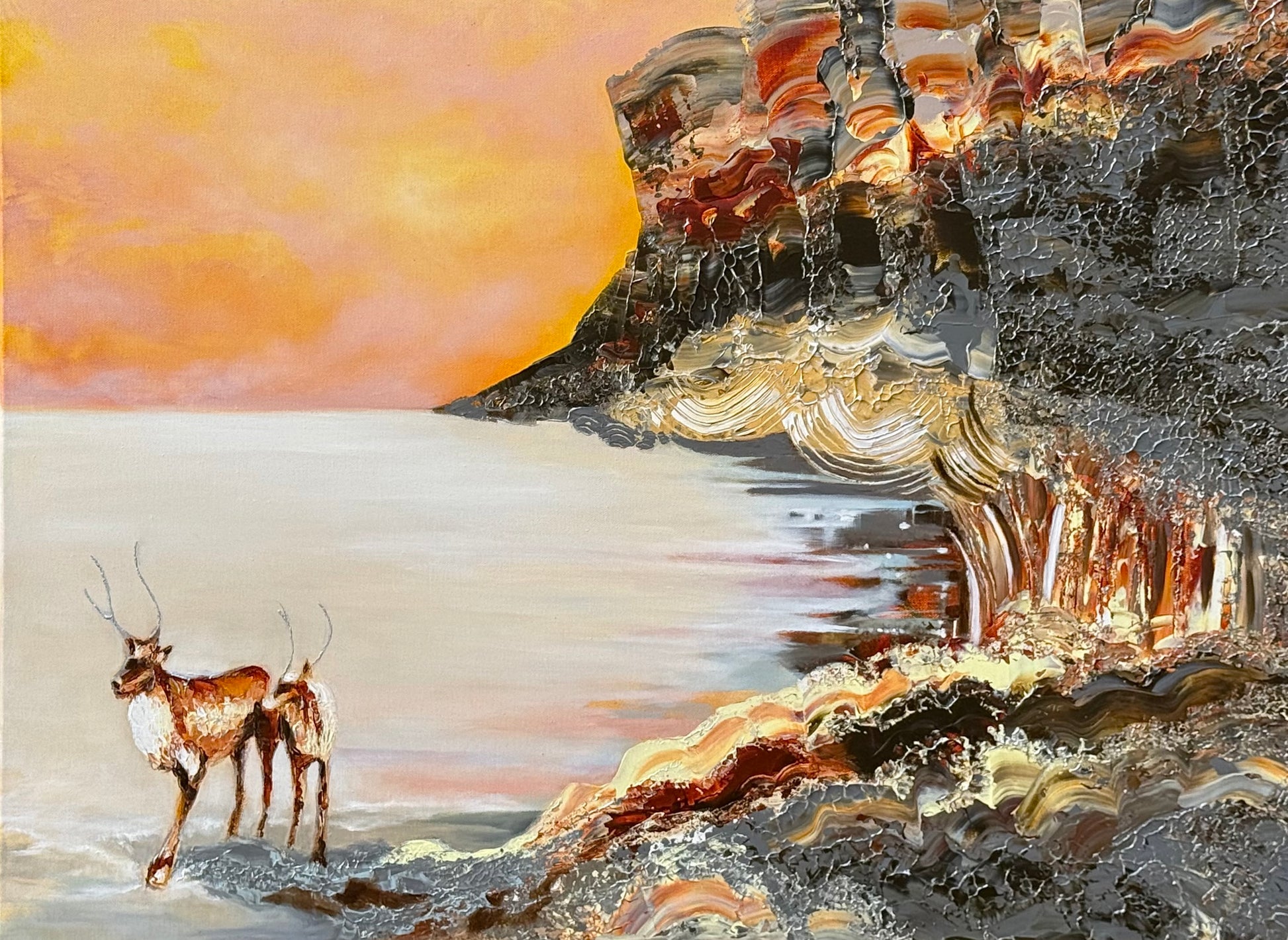 Med “First Step Out” bjuder konstnären in dig att följa med på en resa – bort från det trygga, in i det okända. I förgrunden syns två renar som lämnar en plats, vandrar mot något nytt och oskrivet. I bilden byggs landskapet upp med lager av akryl och olja, där färgen och texturen samspelar för att skapa ett uttrycksfullt djup och en mjuk, flytande övergång mellan former och färgskiftningar.