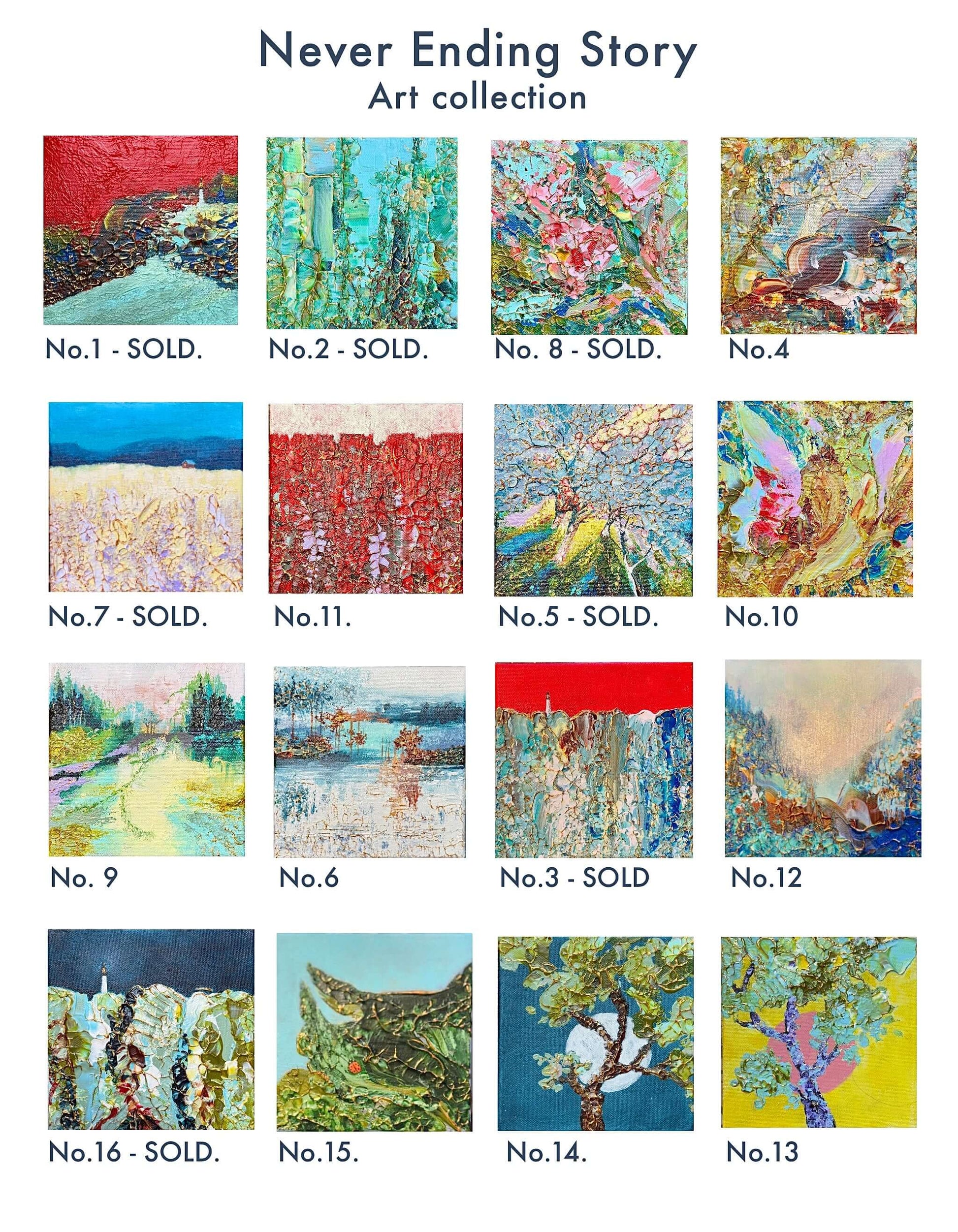 En pågående konstserie där varje målning är ett unikt uttryck och en möjlighet att bli del av en berättelse utan slut. Målad med abstrakt textur som ger varje tavla i kollektionen ett genomgående samspel även om motiv och färg är olika.