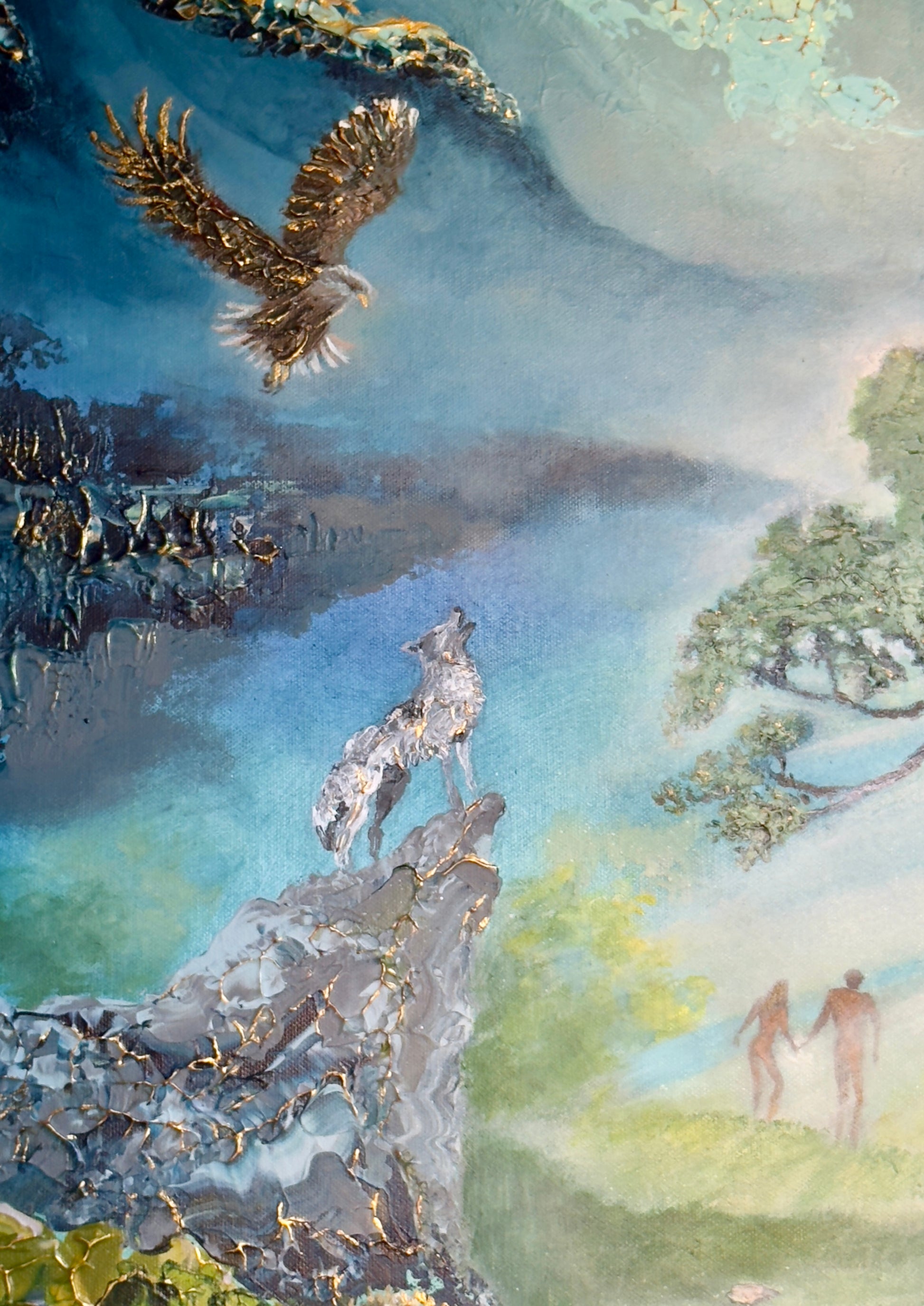 Genom att arbeta med både palettkniv och pensel har konstnären byggt upp lager av akrylfärg som skimrar med liv, skapa mjuka övergångar och samtidigt markerade uttryck. Verket känns inte bara som en bild – det blir till en fysisk upplevelse, där ljus, skugga och form samspelar i en dynamisk helhet. Här finns djur, människa och natur i en unik sättning som liksom sammanstrålar till en slående helhet.