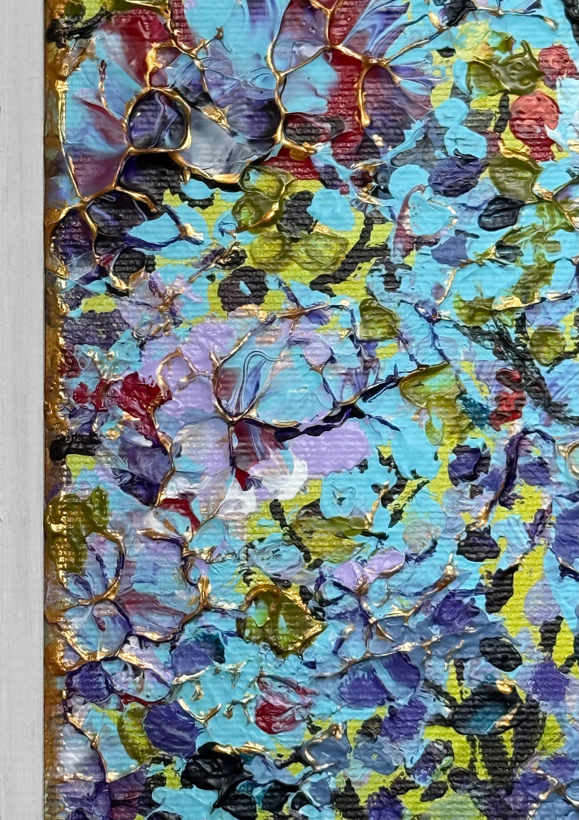 De kraftfulla partierna i målningen balanseras av mjuka övergångar skapade med pensel, vilket ger en harmonisk rytm mellan intensitet och stillhet. Resultatet är ett verk som drar blickarna till sig och samtidigt bjuder in till att stanna upp och upptäcka nya detaljer varje gång man ser på det.