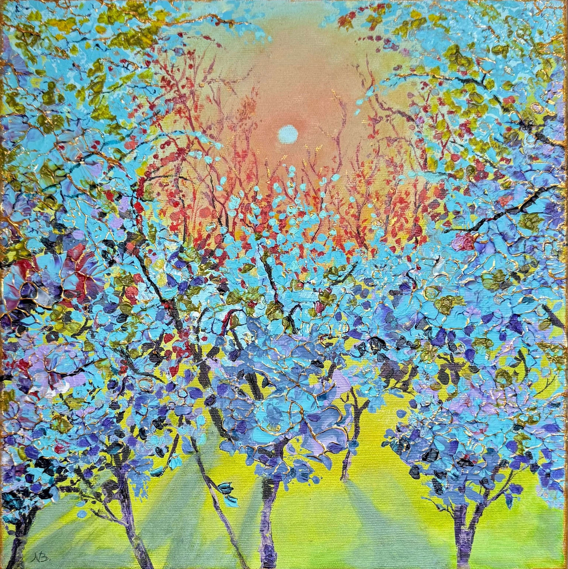 Trädkronor, är en färgstark och livfull originalmålning där naturens energi får flöda fritt över duken. Med palettkniv har konstnären byggt upp dynamiska lager av färg och struktur – varje rörelse i ytan ger liv åt trädens kronor som sträcker sig mot ljuset.